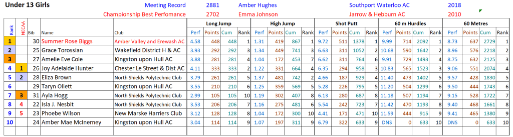 On Sunday 16th March, AVEACs young multi-eventer Summer Biggs, made the long journey up to Gateshead to compete in the North Eastern Counties Athletic Association’s Open Indoor Pentathlon. This was Summer’s final indoor appearance ahead of the outdoor track and field season commencing, and proved to be a fitting end, as she cruised to victory in the Under-13 Girls competition.
